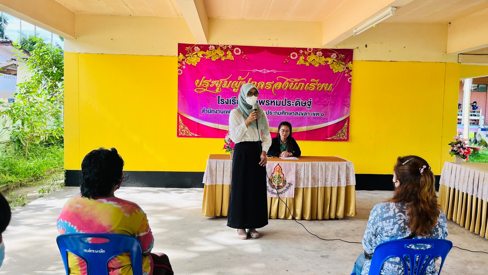 นางสาวปทุมพร เฑียรฆโรจน์ ผู้อำนวยการโรงเรียนวัดพรหมประดิษฐ์ พร้อมด้วยคณะครู จัดการประชุมผู้ปกครองเพื่อชี้แจงนโยบายด้านการจัดการศึกษาและการเตรียมความพร้อมในการเปิดภาคเรียนที่ 1 ปีการศึกษา 2565 ณ ลานประชุมอาคารเรียนใหม่โรงเรียนวัดพรหมประดิษฐ์ อำเภอนาหม่อม จังหวัดสงขลา